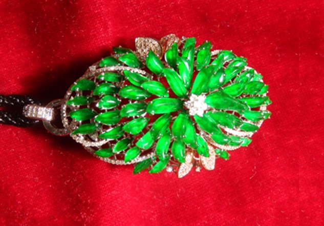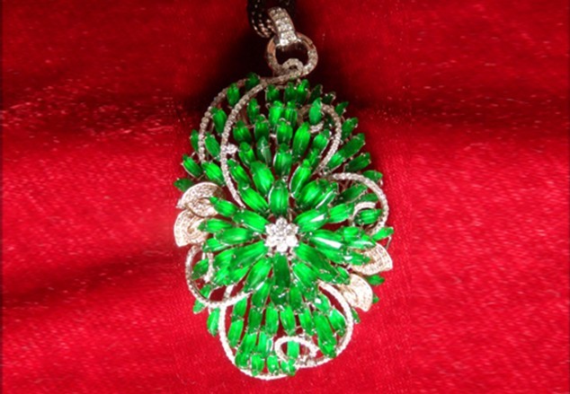由重慶金銀珠寶飾品行業(yè)協(xié)會(huì)、香港國(guó)際珠寶玉石協(xié)會(huì)、重慶市收藏協(xié)會(huì)、廣東博昌展覽有限公司、青島博泰展覽有限公司、重慶博昌會(huì)展有限公司聯(lián)合主辦的“2012中國(guó)重慶國(guó)際珠寶首飾玉石博覽會(huì)”邀請(qǐng)的香港嘉佳福珠寶公司的展位中,就有顏色與其極相同的18k配鉆帝王綠翡翠掛件;據(jù)該公司介紹:1998年公司在緬甸敢帕重金購(gòu)得雞蛋大小原石一個(gè),開口后水種為玻璃地,顏色為黃綠,后在意大利進(jìn)行鑲嵌,這次在展會(huì)上首次以108萬(wàn)的最底價(jià)展示,競(jìng)賣。
